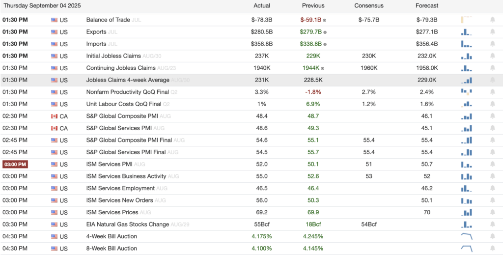 Weekly jobless claims ticked higher to 237,000, with continuing claims steady near 1.94 million. The trade deficit widened to $78.3 billion in July as imports climbed to $358.8 billion against exports of $280.5 billion.