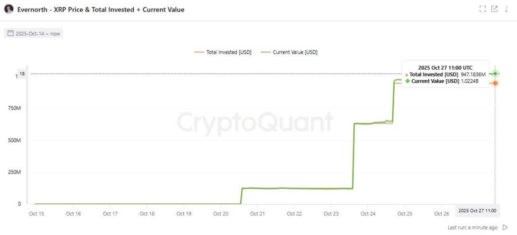 On Oct. 27, blockchain analytics platform CryptoQuant reported that Evernorth spent roughly $947 million acquiring 388.7 million XRP during its first week of operation. This effectively completes about 95% of the firm’s $1 billion XRP purchase target.